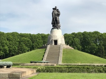 Das Sowjetische Ehrenmal ist eine Gedenkstätte und ein Soldatenfriedhof im Treptower Park in Berlin. Die im Mai 1949 fertiggestellte Anlage wurde auf Weisung der Sowjetischen Militäradministration in Deutschland errichtet, um die im Zweiten Weltkrieg gefallenen Soldaten der Roten Armee zu ehren. Es wurden ca. 7000 der in der Schlacht um Berlin gefallenen Soldaten hier bestattet. Ein breit angelegter, leicht ansteigender und von „trauernden“ Birken gesäumter Weg führt zum Hauptfeld der Gedenkstätte. Der Weg ist markiert durch zwei große, stilisierte Fahnen. An ihrer Stirnseite befindet sich jeweils die Skulptur eines knienden Soldaten in voller Montur und mit einer Maschinenpistole bewaffnet. Sechzehn weiße Sarkophage stehen entlang der äußeren Begrenzung. Sie sind auf den beiden Längsseiten mit Reliefs aus der Geschichte des Großen Vaterländischen Krieges der Sowjetvölker versehen und tragen auf der dem zentralen Feld zugewandten Schmalseite Zitate von Josef Stalin. Der zentrale Ort der Anlage wird durch eine auf einem Sockel stehende Skulptur „Der Befreier“ von Jewgeni Wutschetitsch gebildet. Die Figur stellt einen Soldaten dar, der in der rechten Hand ein Schwert und auf dem linken Arm schützend ein Kind trägt; ein Hakenkreuz zerbricht unter seinen Stiefeln. Die Skulptur ist 12 Meter hoch und 70 Tonnen schwer.