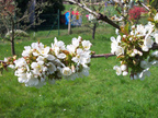 Das Foto zeigt einen blühenden Kirschbaum vor einem Haus mit roter Fassade. Das Bild ist unter CC0 lizenziert und kann somit frei verwendet werden.