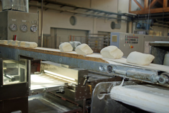 Das Bild zeigt Technik in einer Bäckerei. Zu sehen ist ein Förderband mit Teigportionen. Das Bild ist unter CC0 lizenziert und kann somit frei verwendet werden.
