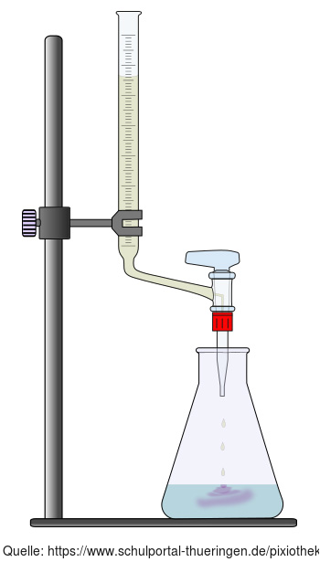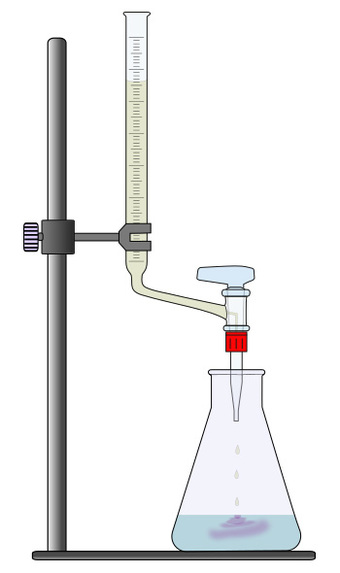 Das Bild gehört zur Serie "Chemie Grafiken". Es zeigt die Titration (Maßanalyse) einer Maßlösung mit Bürette und Erlenmeyerkolben. Das Bild ist unter CC0 lizenziert und kann somit frei verwendet werden.