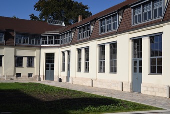 Das Foto gehört zur Serie "Bauhaus in Weimar". Im Zeitrahmen 1904 bis 1911 wurde nach Plänen Henry van de Veldes die Kunstgewerbeschule und später der Hochschulbau für Bildende Kunst in Weimar errichtet (heutiges Hauptgebäude der Bauhaus-Universität Weimar). Es ist eines der bedeutendsten Kunstschulbauten der Jahrhundertwende und war 1919 Gründungsort des von Walter Gropius ins Leben gerufene Staatlichen Bauhauses. Nach Art und Konzeption war es in dieser Zeit etwas völlig Neues, da das Bauhaus eine Zusammenführung von Kunst und Handwerk darstellte. Es gelten die Nutzungsbedingungen der Mediothek und Pixiothek.