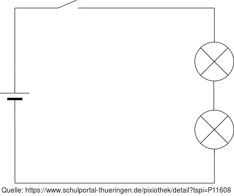 Das Bild gehört zur Serie "Elektrische Schaltungen". Es zeigt den Schaltplan einer Reihenschaltung mit Spannungsquelle (Batterie), Schalter und zwei Verbrauchern (Glühlampen). Das Bild ist unter CC0 lizenziert und kann somit frei verwendet werden.