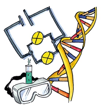 Das Bild gehört zur Serie "Schulfächer". Es zeigt ein gezeichnetes Symbolbild für Naturwissenschaften: Physik, Biologie, Chemie. Es gelten die Nutzungsbedingungen der Mediothek und Pixiothek.