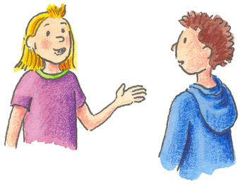 Das Bild gehört zur Serie "Kinder". Es zeigt einen gezeichneten Jungen und ein Mädchen im Gespräch. Es gelten die Nutzungsbedingungen der Mediothek und Pixiothek.