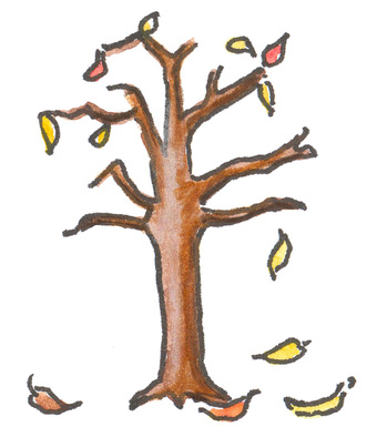 Das Bild zeigt ein gezeichnetes Herbstbild mit Baum und Blätterfall. Es gelten die Nutzungsbedingungen der Mediothek und Pixiothek.