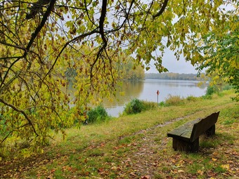Ein Ort zum Verweilen mit Blick auf einen See im herbstlichen Ambiente. Es gelten die Nutzungsbedingungen der Mediothek und Pixiothek.