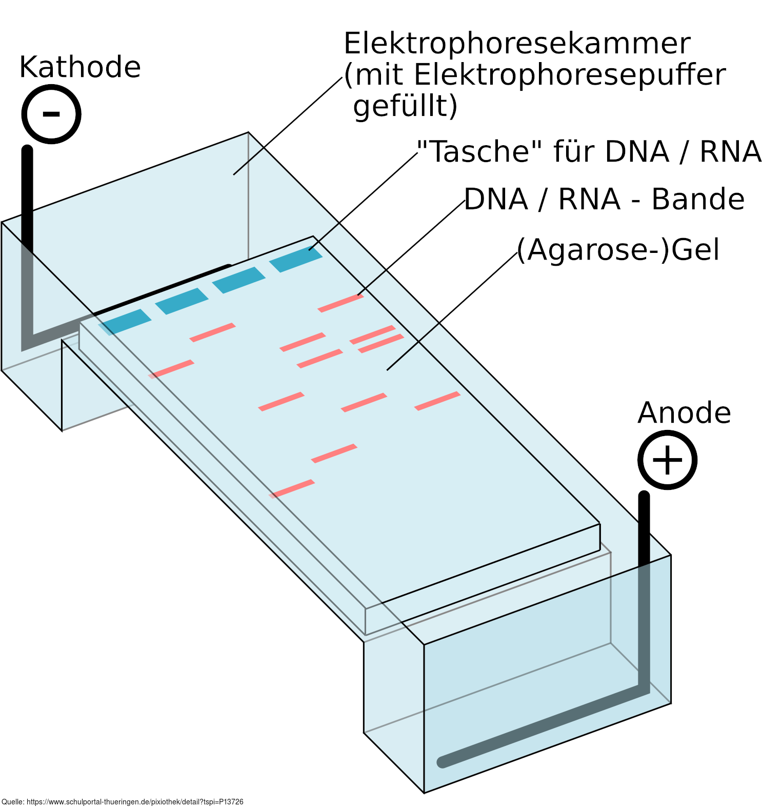 Beschriftete Skizze einer Elektrophoresekammer zur Elektrophorese eines DNA- oder RNA-Agarosegels.
