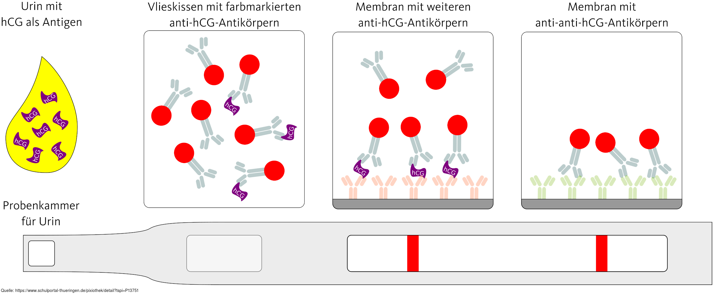 Aufbau/Ablauf eines lateral-flow-assays am Beispiel eines Schwangerschaftstest. Es gelten die Nutzungsbedingungen der Mediothek und Pixiothek. Auf http://unterricht.petzinger.net/biochdropbox.html auch als svg und in CC-BY verfügbar.