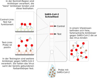 Aufbau/Ablauf eines lateral-flow-assays am Beispiel eines SARS-CoV-2 Schnelltests.