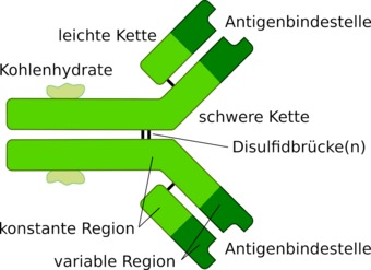 Aufbau eines Antikörpers der IgG-Klasse. Es gelten die Nutzungsbedingungen der Mediothek und Pixiothek. Auf http://unterricht.petzinger.net/biochdropbox.html auch als svg und in CC-BY verfügbar.