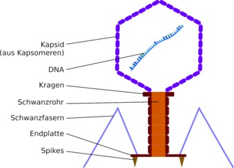 Molekularer Aufbau eines Bakteriophagen. Es gelten die Nutzungsbedingungen der Mediothek und Pixiothek. Auf http://unterricht.petzinger.net/biochdropbox.html auch als svg und in CC-BY verfügbar.