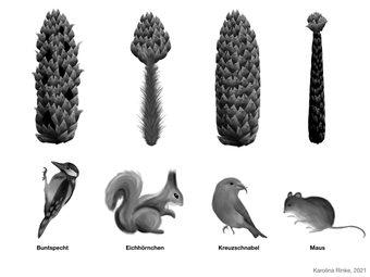 Die Grafik gehört zur Serie "Fraßspuren". Dargestellt sind Zapfenfraßspuren von Maus, Eichhörnchen, Buntspecht und Fichtenkreuzschnabel in richtiger Zuordnung, s/w. Es gelten die Nutzungsbedingungen der Mediothek und Pixiothek.