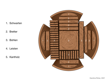 Die Grafik gehört zur Serie "Holzbearbeitung". Dargestellt sind Arten von Schnittholz, die in einem Sägewerk aus einem Baumstamm hergestellt werden, Bild-Variante: farbig, mit Beschriftung. Es gelten die Nutzungsbedingungen der Mediothek und Pixiothek.