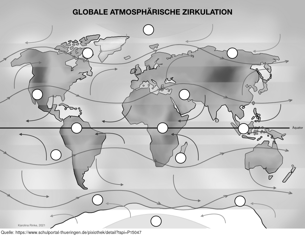 Das Bild gehört zur Serie „Zirkulationssysteme der Erde“. Es verdeutlicht die globale atmosphärische Zirkulation der Erde. Bild-Variante: s/w; unbeschriftet; mit Pfeilen für Winde. Es gelten die Nutzungsbedingungen der Mediothek und Pixiothek.