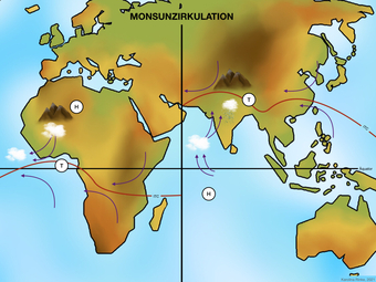 Das Bild gehört zur Serie „Zirkulationssysteme der Erde“. Es verdeutlicht die Monsunzirkulation der Erde. Bild-Variante: farbig; unbeschriftet; mit Pfeilen für Winde. Es gelten die Nutzungsbedingungen der Mediothek und Pixiothek.