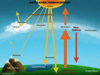 Das Bild verdeutlicht den natürlichen Treibhauseffekt. Bild-Variante: farbig; beschriftet. Es gelten die Nutzungsbedingungen der Mediothek und Pixiothek.