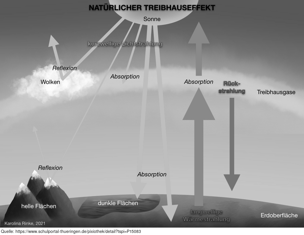 Das Bild verdeutlicht den natürlichen Treibhauseffekt. Bild-Variante: s/w; beschriftet. Es gelten die Nutzungsbedingungen der Mediothek und Pixiothek.