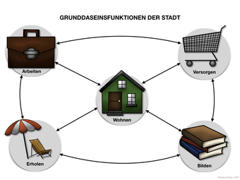 Das Bild verdeutlicht die Grunddaseinsfunktionen (der Stadt). Bild-Variante: farbig; beschriftet. Es gelten die Nutzungsbedingungen der Mediothek und Pixiothek.