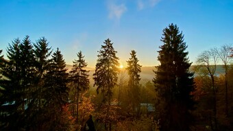 Das Bild zeigt einen herbstlichen Sonnenaufgang im Weimarer Land in Thüringen. Es gelten die Nutzungsbedingungen der Mediothek und Pixiothek.