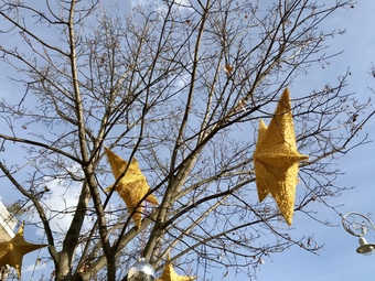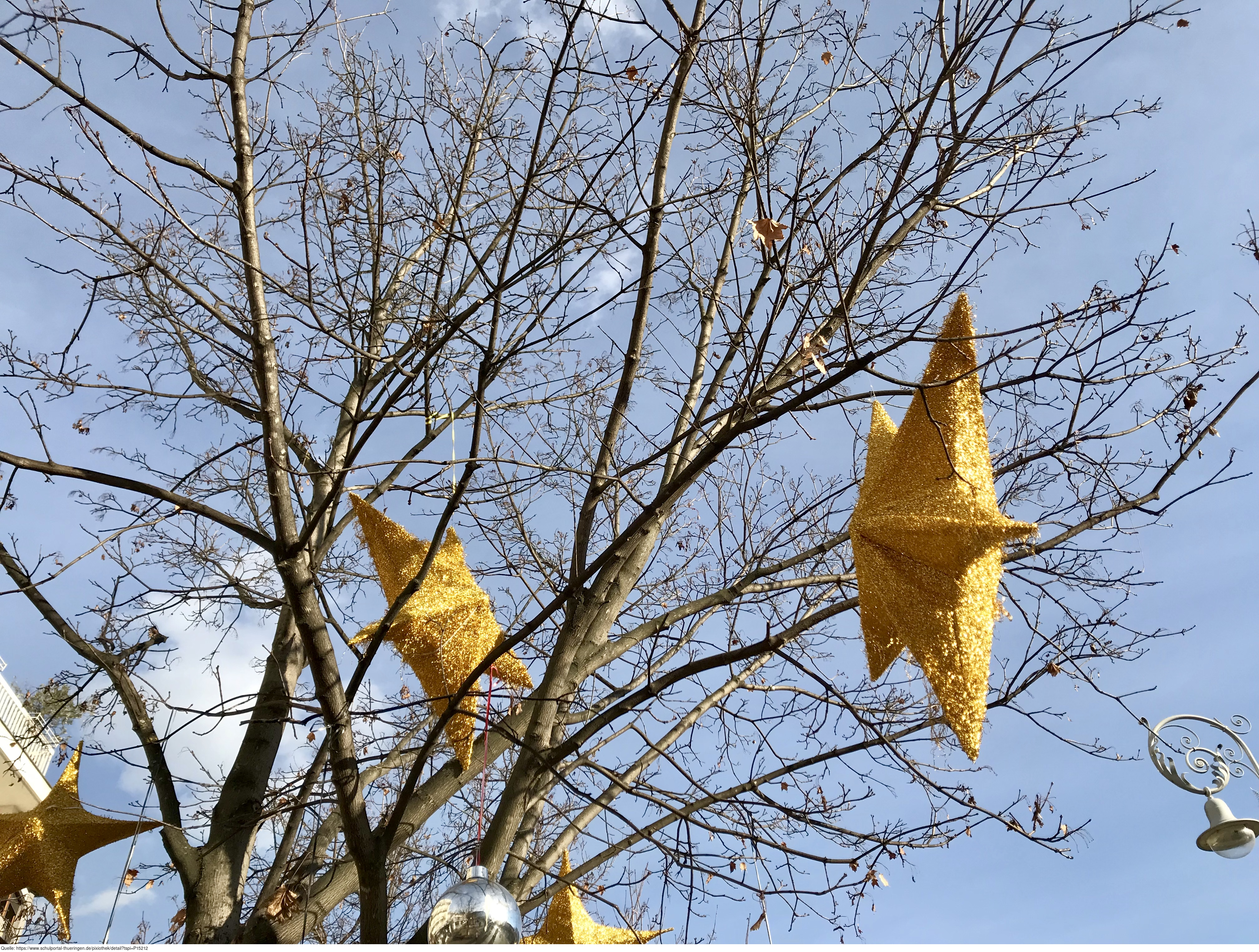 Weihnachtliche Dekoration mit Sternen an einem Baum. Es gelten die Nutzungsbedingungen der Mediothek und Pixiothek.