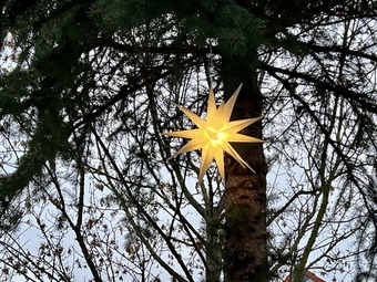 Weihnachtliche Dekoration mit einem Stern an einem Baum. Es gelten die Nutzungsbedingungen der Mediothek und Pixiothek.