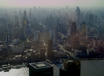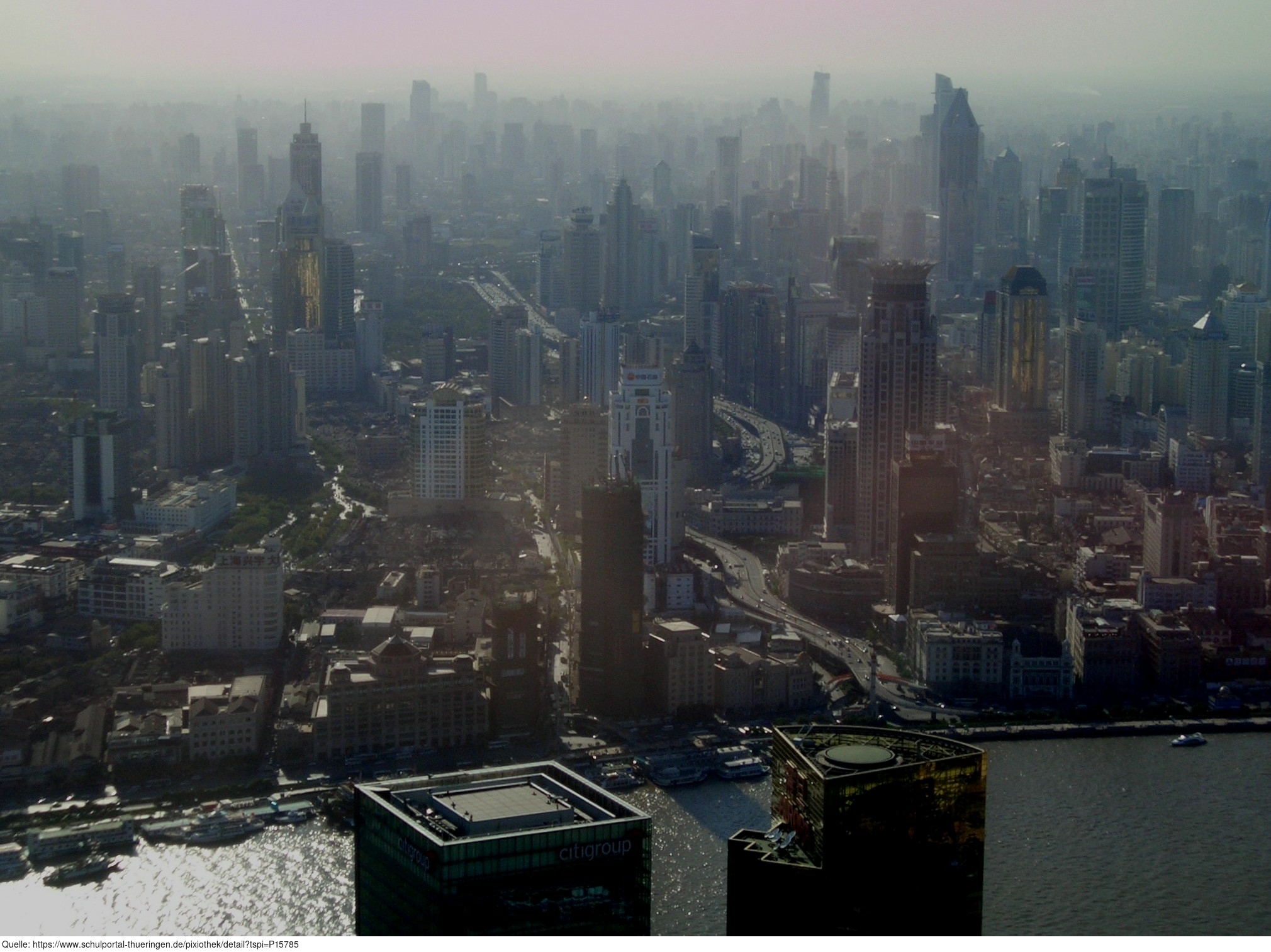 Das Foto gehört zu einer Serie mit 3 Motiven der Stadt Shanghai, aufgenommen im Oktober 2005. Die Fotos liegen jeweils im Original vor (sonniges Wetter, aber dunstig) sowie in einer bearbeiteten Version (Helligkeit herab-, Kontrast heraufgesetzt, Farbtemperatur und -ton verbessert; subjektiver Eindruck). Die Bilder dieser Serie können als Anregung bzw. als Einstieg für das Thema Bildbearbeitung dienen.