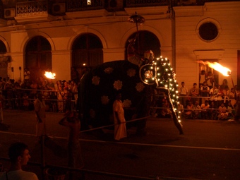 Das Foto ist Teil eines Bildpaares mit dem Motiv eines geschmückten Elefanten, aufgenommen bei der Zahnprozession in Kandy, Sri Lanka, dem Fest Esala Perahera. Im Original ist das Foto zu dunkel und zu farbstichig. In der bearbeiteten Version wurden die Helligkeit herauf- und der Kontrast herabgesetzt sowie die Farbtemperatur und -ton verbessert (subjektiver Eindruck). Das Bildpaar kann als Anregung bzw. als Einstieg für das Thema Bildbearbeitung dienen.