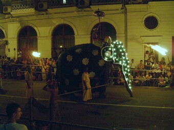 Das Foto ist Teil eines Bildpaares mit dem Motiv eines geschmückten Elefanten, aufgenommen bei der Zahnprozession in Kandy, Sri Lanka, dem Fest Esala Perahera. Im Original ist das Foto zu dunkel und zu farbstichig. In der bearbeiteten Version wurden die Helligkeit herauf- und der Kontrast herabgesetzt sowie die Farbtemperatur und -ton verbessert (subjektiver Eindruck). Das Bildpaar kann als Anregung bzw. als Einstieg für das Thema Bildbearbeitung dienen.