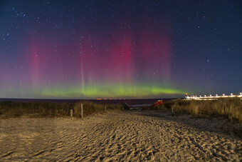 Das Bild gehört zur Serie „Polarlichter 2023 Zingst“. Es zeigt Polarlichter, die in der Nacht vom 26. Auf den 27. Februar 2023 gegen 0:30 in Zingst auf dem Darß mit einer Canon EOS RP aufgenommen wurden. Die Kameraeinstellungen: ISO 1600; Blende 2,8; 15 Sekunden Belichtung; manueller Modus. Das Foto wurde nachträglich bearbeitet. Mit bloßem Auge waren die Polarlichter in dieser Nacht deutlich zu sehen, aber natürlich nicht so farbenfroh wie auf dem Foto. Es gelten die Nutzungsbedingungen der Mediothek und Pixiothek.
