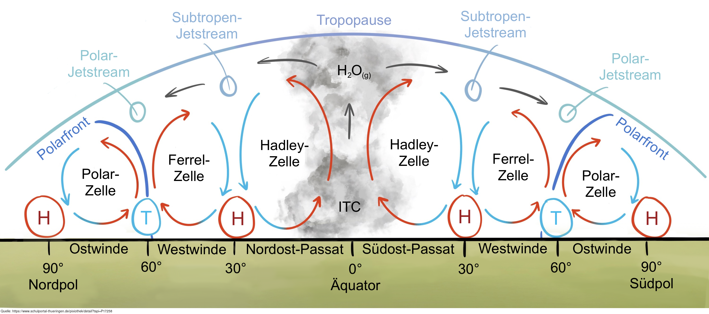 Das Bild gehört zur Serie „Windsysteme“. Es gibt aus der Querschnittsperspektive einen Überblick über die globale Windzirkulation. Variante: farbig; beschriftet. Es gelten die Nutzungsbedingungen der Mediothek und Pixiothek.