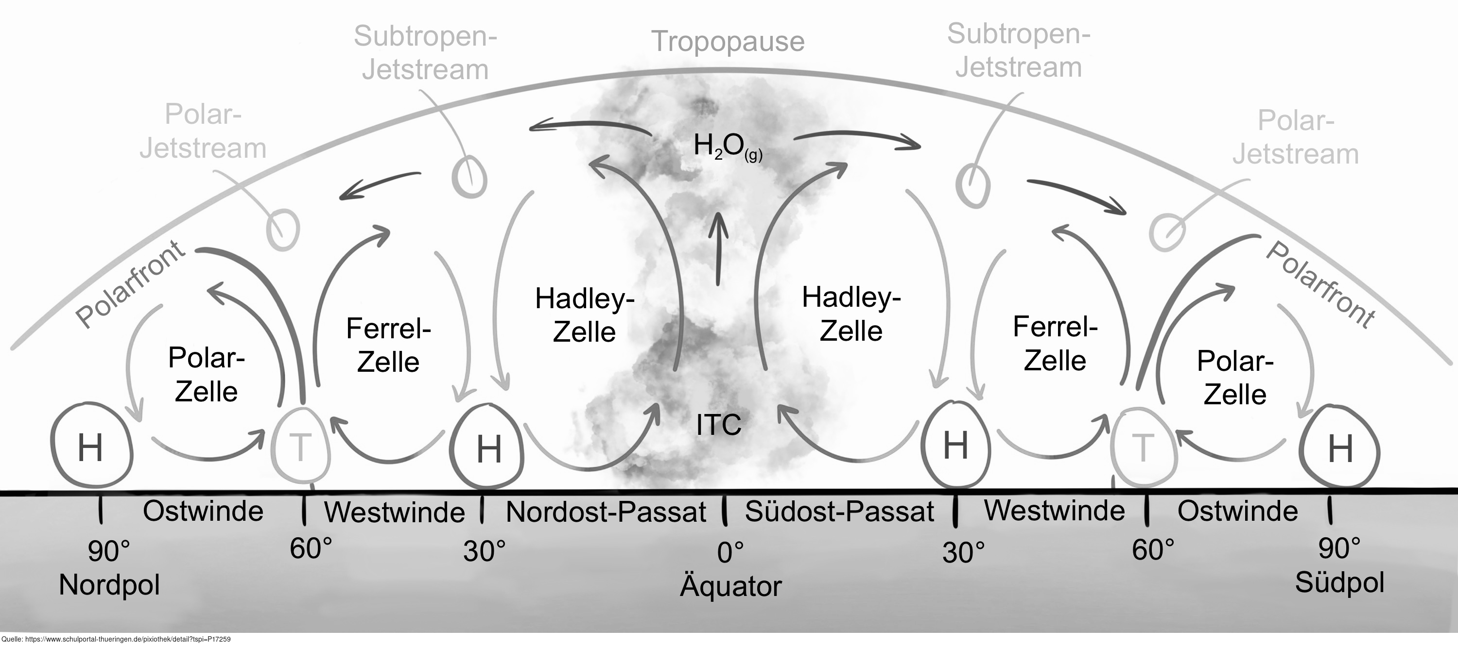 Das Bild gehört zur Serie „Windsysteme“. Es gibt aus der Querschnittsperspektive einen Überblick über die globale Windzirkulation. Variante: s/w; beschriftet. Es gelten die Nutzungsbedingungen der Mediothek und Pixiothek.
