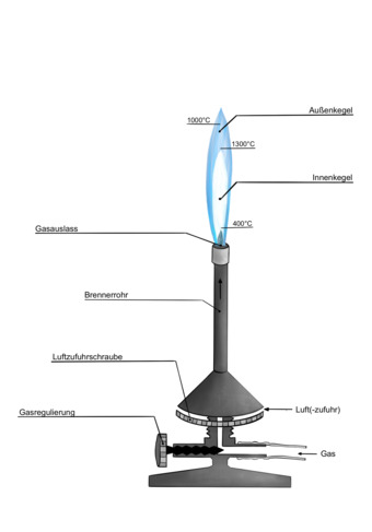 Das Bild verdeutlicht den Aufbau eines Bunsenbrenners. Variante: eine Flamme, farbig; beschriftet. Es gelten die Nutzungsbedingungen der Mediothek und Pixiothek.