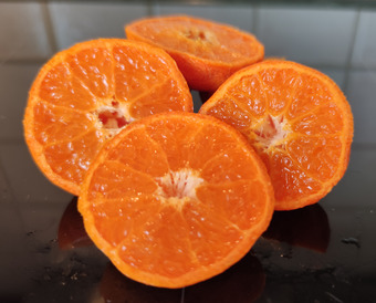 Das Bild gehört zur Serie "Obst". Zu sehen sind aufgeschnittene Mandarinen. Es gelten die Nutzungsbedingungen der Mediothek und Pixiothek.