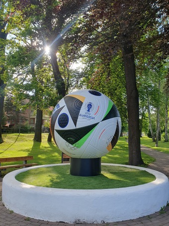 Das Bild zeigt einen überdimensionalen Fußball im kleinen Stadtpark von Blankenhain. Das Weimarer Land ist Gastgeber für den europäischen Fußball durch das Engagement des Spa & Golf Resort Weimarer Land in Blankenhain. Dort gastiert die englische Nationalmannschaft während ihres gesamten Aufenthalts in Deutschland. Auch die deutsche Nationalmannschaft nutzt das Quartier für ihre Vorbereitungsphase.