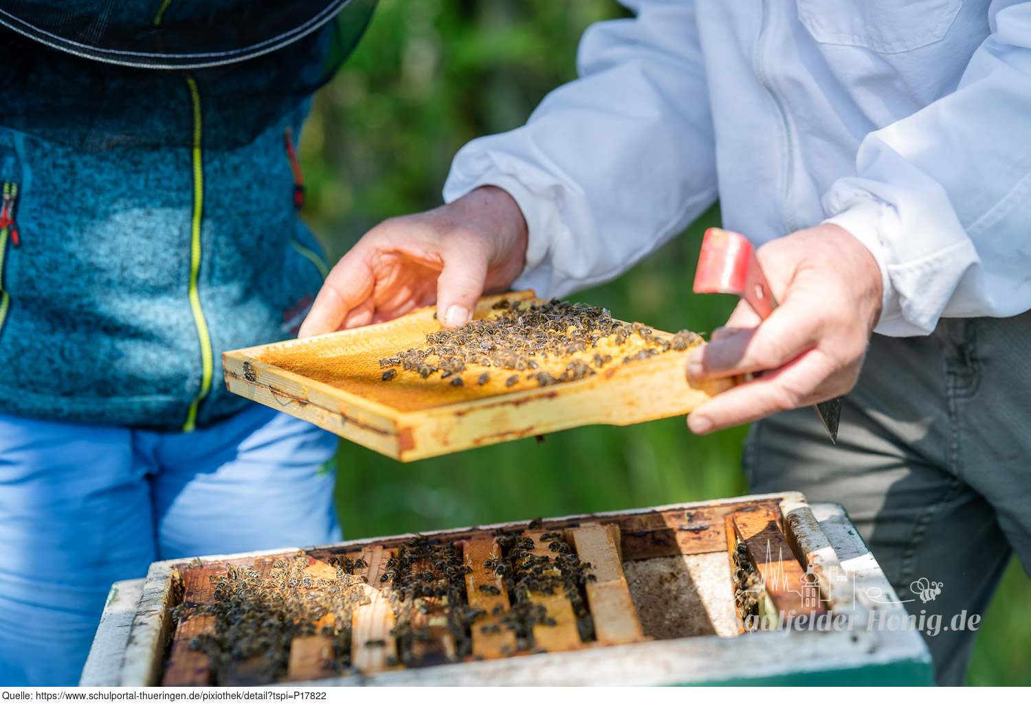Das Bild gehört zur Serie "Saalfelder Honig", aufgenommen vom Imker Bernd Rümpler, Inhaber von saalfelder-honig.de. Zu sehen ist ein Imker am geöffneten Bienenvolk mit gezogener Wabe. Es gelten die Nutzungsbedingungen der Mediothek und Pixiothek.