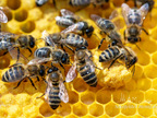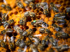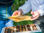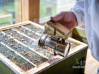 Das Bild gehört zur Serie "Saalfelder Honig", aufgenommen vom Imker Bernd Rümpler, Inhaber von saalfelder-honig.de. Zu sehen ist ein Imker mit Stockmeisel am geöffnetem Bienenvolk beim Ziehen einer Wabe.