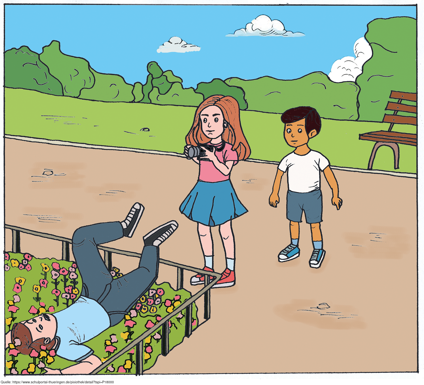 Das Bild zeigt einen Vater, der von seiner Tochter mit einem Fotoapparat fotografiert wird und währenddessen nach hinten in ein Blumenbeet fällt.. Das Bild kann als Teil einer Bildergeschichte verwendet werden - siehe Funktionslink "Weitere Bilder der Serie". Es gelten die Nutzungsbedingungen der Mediothek und Pixiothek.