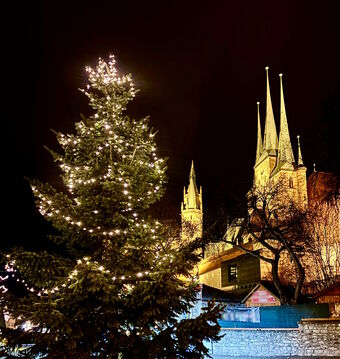 Das Foto gehört zur Serie "Weihnacht". Das Bild zeigt eine geschmückte Fichte auf dem Erfurter Weihnachtsmarkt vor der St. Severi-Kirche. Es gelten die Nutzungsbedingungen der Mediothek und Pixiothek.
