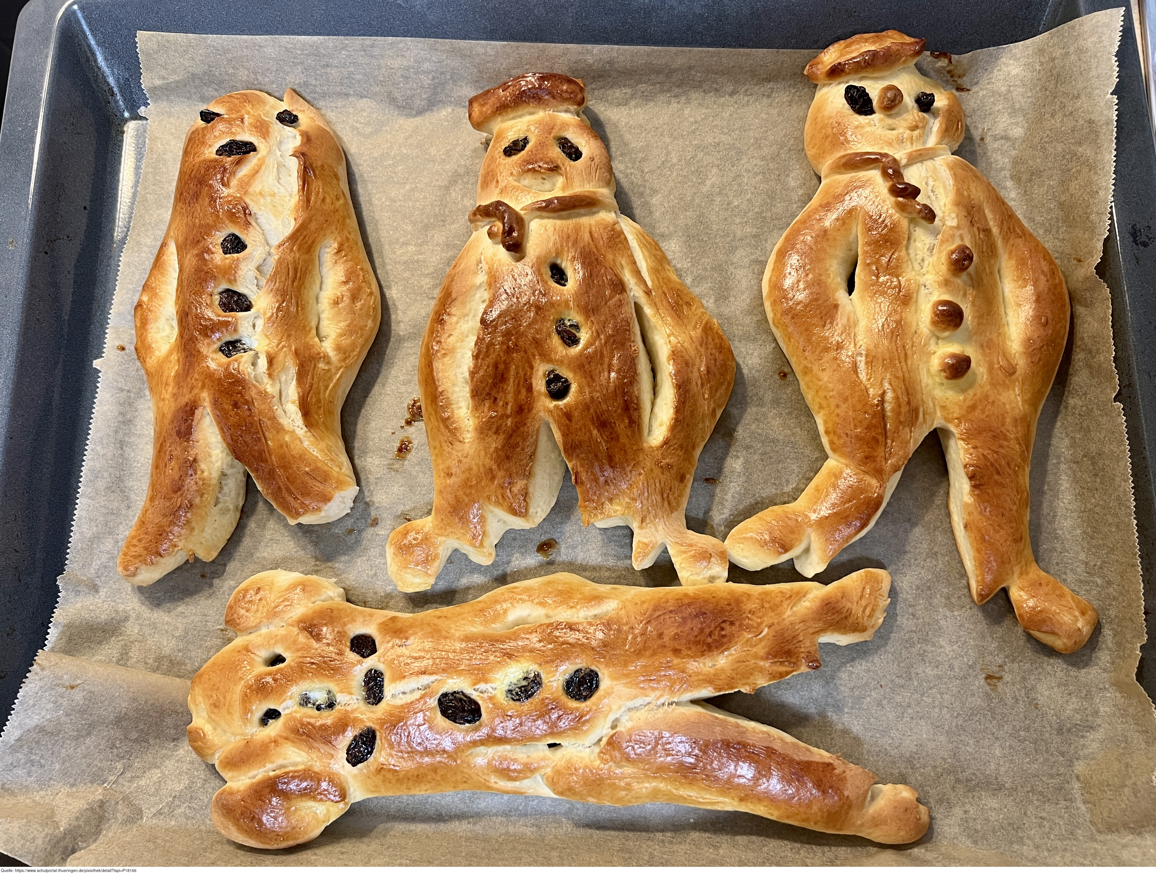 Das Foto zeigt einige fertig gebackene Weckmänner. Als Weckmann wird ein Gebäck in Form eines stilisierten Mannes aus Hefeteig bezeichnet, welches oftmals mit Rosinen verziert ist. Es gelten die Nutzungsbedingungen der Mediothek und Pixiothek