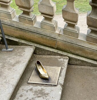 Das Bild zeigt den verlorenen Schuh auf der Außentreppe von Schloss Moritzburg als Bronzeskulptur. Hier wurde die Szene der Außenaufnahmen zum Film „Drei Haselnüsse für Aschenbrödel“ gedreht.
