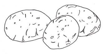 Das Bild zeigt gezeichnete Kartoffeln (s/w). Es gehört zur Serie "Ernährungspyramide zum Basteln und Gestalten" und findet u.a. im gleichnamigen Lernobjekt unter https://www.schulportal-thueringen.de/web/guest/media/detail?tspi=18517 Verwendung. Es gelten die Nutzungsbedingungen der Mediothek und Pixiothek.