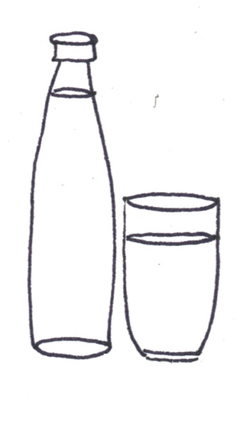 Das Bild zeigt eine gezeichnete Flasche und ein Glas mit Wasser (s/w). Es gehört zur Serie "Ernährungspyramide zum Basteln und Gestalten" und findet u.a. im gleichnamigen Lernobjekt unter https://www.schulportal-thueringen.de/web/guest/media/detail?tspi=18517 Verwendung. Es gelten die Nutzungsbedingungen der Mediothek und Pixiothek.