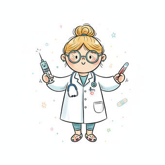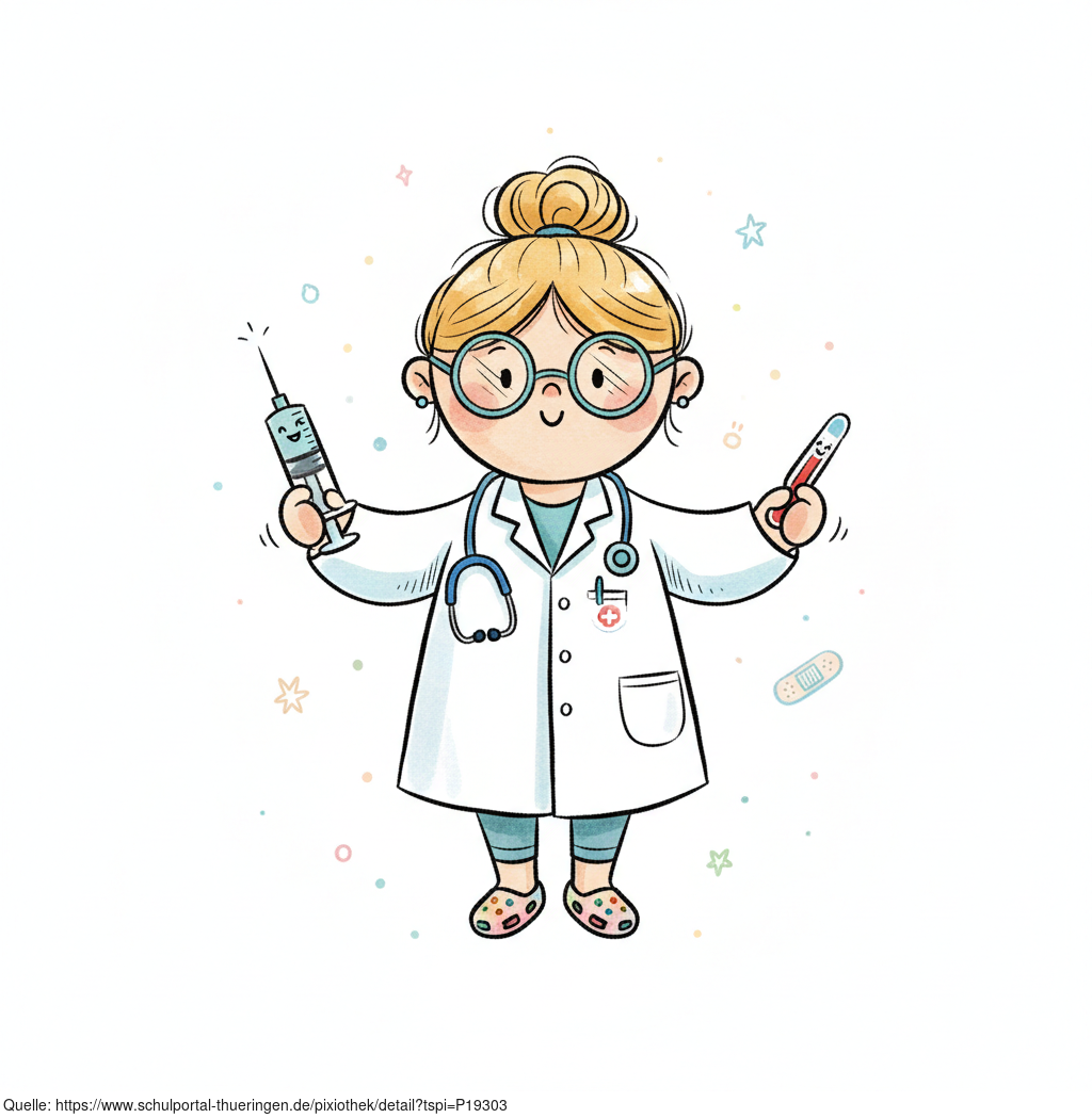 Das Bild zeigt eine gezeichnete Ärztin mit Stethoskop, Spritze und Thermometer. Das Bild wurde mittels einer KI (Gemini) erstellt und ist unter CC0 lizenziert. Weitere Bilder aus Herrn Emrich-Försters Bild-Archiv findet man hier: https://pix.foerster.rocks/