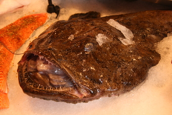 Abgebildet ist ein Seeteufel auf dem Fischmarkt von Bergen.