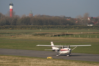 Abgebildet ist ein einmotoriges Flugzeug bei der Landung auf Wangerooge.