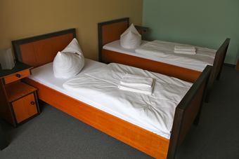 Abgebildet sind Betten und ein Nachtschrank.