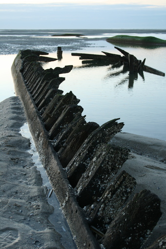 Abgebildet ist ein Schiffswrack am Strand.