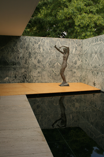 Das Foto gehört zur Serie "Deutscher Weltausstellungspavillon Barcelona 1929". Der deutsche Architekt Ludwig Mies van der Rohe entwarf diesen Pavillon. Er gilt heute als Architekturikone des 20. Jahrhunderts. Das Bild zeigt den Innenraum vom Pavillon mit der Skulptur "Der Morgen" des Künstlers Geog Kolbe. Es gelten die Nutzungsbedingungen der Mediothek und Pixiothek.
