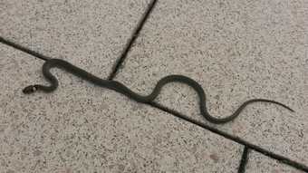 Zu sehen ist eine Ringelnatter auf einer sonnigen Terrasse im Herbst. Es gelten die Nutzungsbedingungen der Mediothek und Pixiothek.