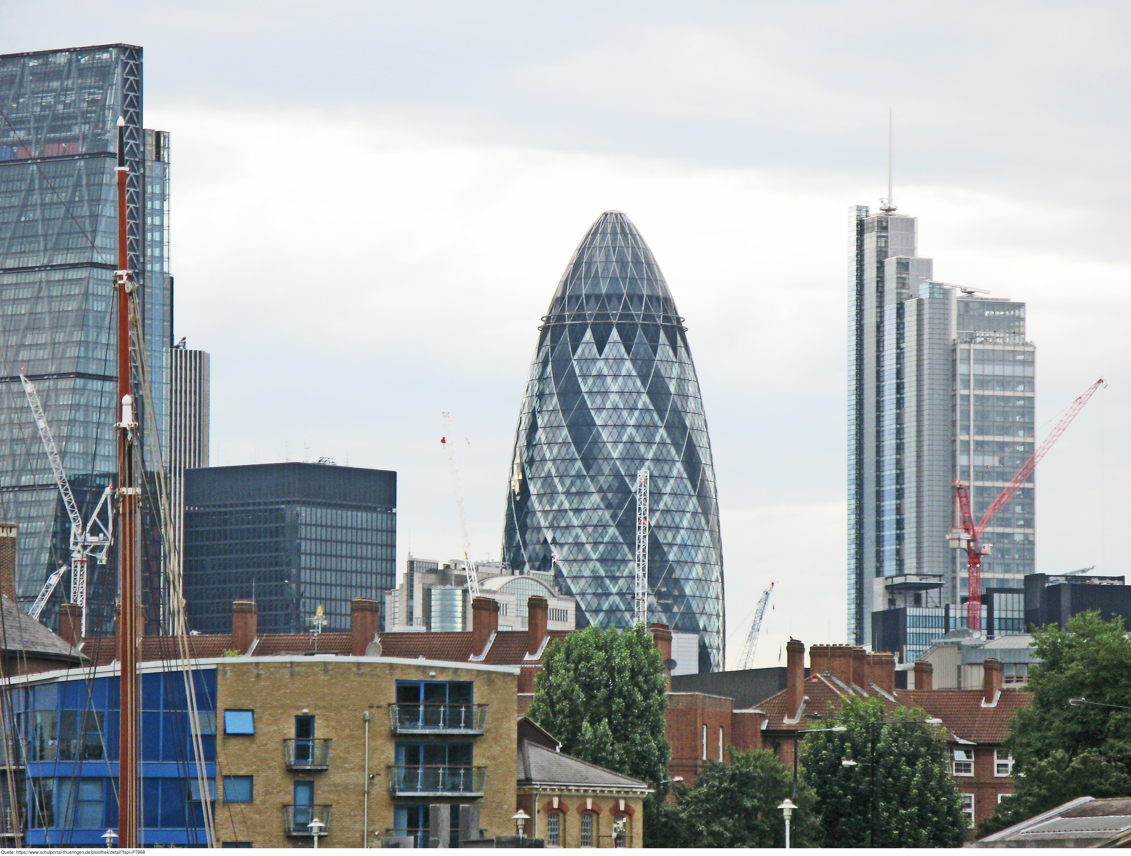 Das Foto gehört zur Serie London 2016. Es zeigt im Zentrum das Hochhaus 30 St Mary Axe, oft als "The Gherkin" (Gewürzgurke) bezeichnet. Als Büroturm einer Rückversicherung ist er auch unter dem Namen "Swiss Re Tower" bekannt. Es gelten die Nutzungsbedingungen der Mediothek und Pixiothek.